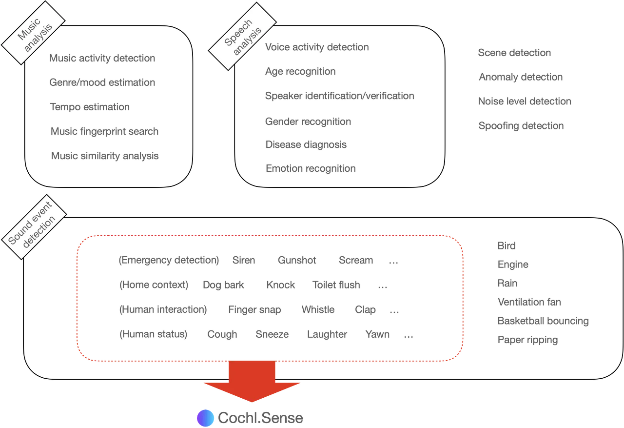 그러나 더 근본적인 원인은 "음성인식 외의 청각 인공지능"이 한 마디로 설명이 안 되는 방대한 분야라는 것이다. 현재 Cochl의 주력 아이템인 Cochl.Sense에서는 Siren, Snore, Toilet flush 등 24가지의 환경음을 인식 기능을 제공한다. 당연히도 세상에 존재하는 환경음은 훨씬 더 많다. 환경음 외에도, 음악에서 장르(genre)나 템포(tempo) 같은 정보를 분석하는 것도 청각 인공지능에 속한다. 그리고 음성에서 음성인식 기술이 놓치는 성별(gender) 정보나 질병 유무를 알아내는 기술도 역시 청각 인공지능에 속한다.