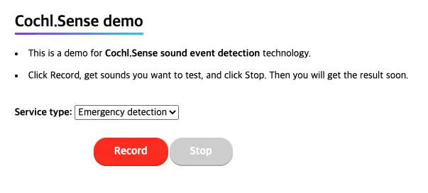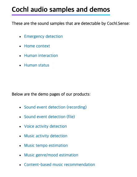 현재 웹데모로 구현된 Cochl의 기술들은 크게 Cochl.Sense와 Cochl.Music으로 categorize 될 수 있다.