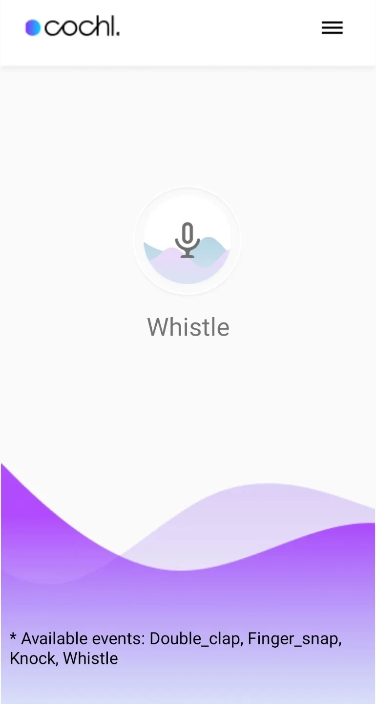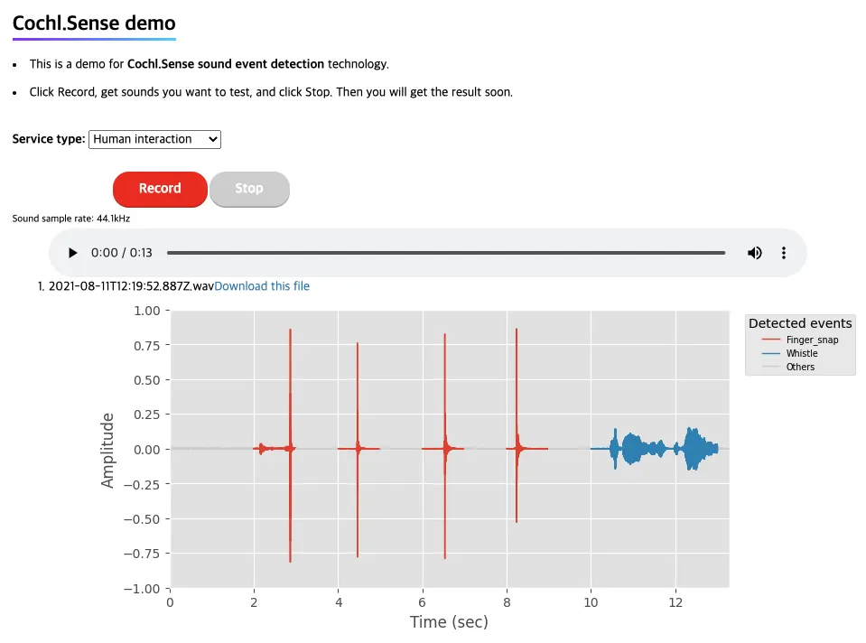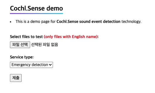 Sound event detection: 환경음을 인식하는 기술이다. 현재는 Cochl.Sense의 4가지 서비스에 포함되는 24가지 환경음을 인식한다. 본 데모에서는 1초 단위의 인식 결과를 제공한다.