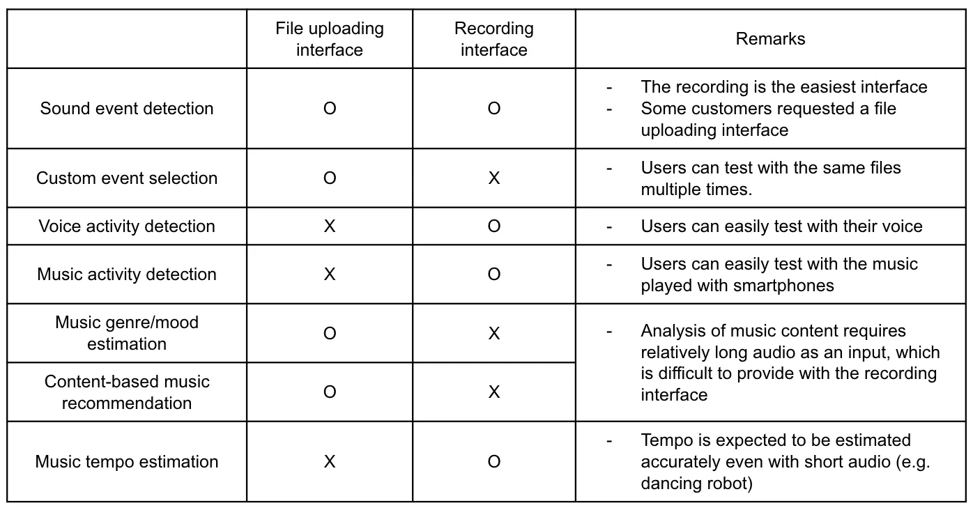 그러나 Recording interface를 사용하는 것이 언제나 편한 것은 아니다. 예를 들어, 음악 장르 분석의 경우는 기보유 음원 파일로 테스트하는 use case가 많을 수 있어서 오히려 recording interface가 불편할 수도 있다. 이처럼 각 task마다 편한 인터페이스 방식이 다르므로 file uploading interface로 할지, recording interface로 할지 분석하였다. 그 고민의 결과는 아래 표 1과 같다.