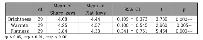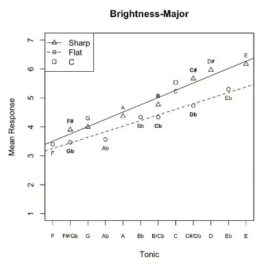 Our study aimed to investigate the effects of sharp and flat keys on the perception of brightness, warmth, and sharpness, given that these keys are associated with tension and relaxation respectively in music.