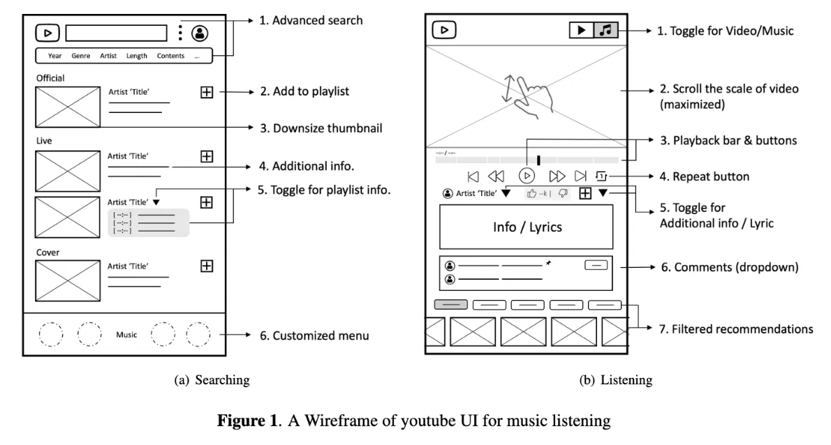 Furthermore, we have developed the wireframe for a new youtube UI for music listening, providing practical solutions to improve user satisfaction. This work has significant implications for YouTube and other music streaming platforms aiming to enhance their user experience.