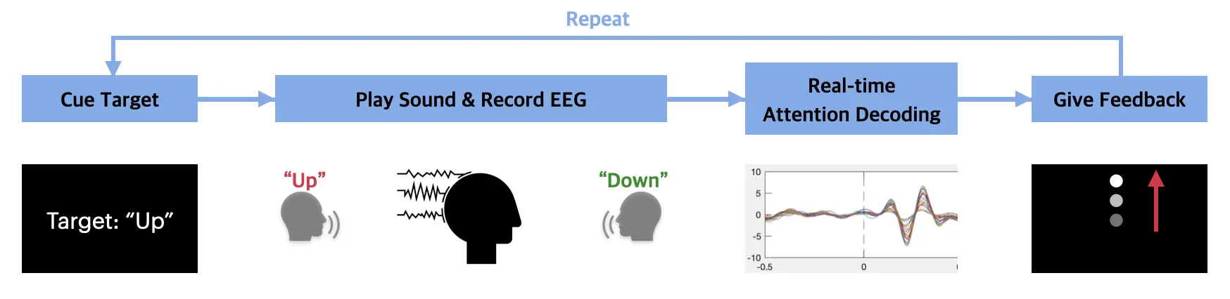 Our system integrates EEG measurement, presentation of attention objectives, sound presentation, real-time auditory attention decoding, and feedback on attention success.