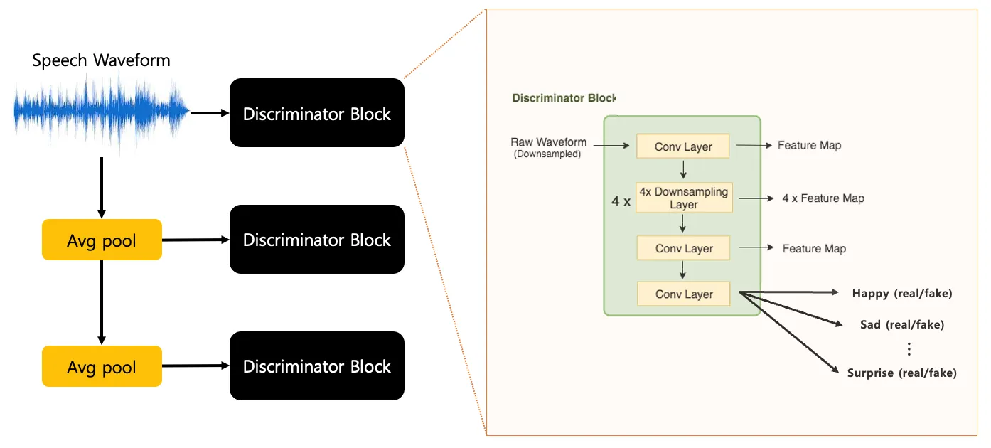 Each average pooling layer downsamples speech waveform by a factor of 2 and 4 respectively, and each discriminator block outputs 6 of different levels of feature maps hierarchically and final output for each emotion domains which is a probability distribution each given by the discriminator.