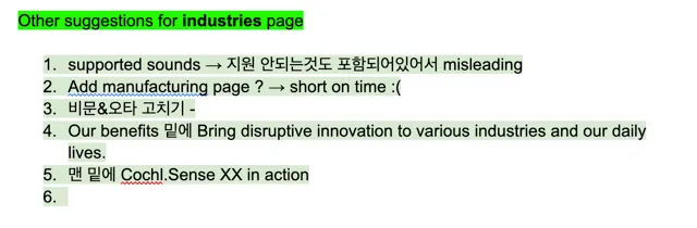 수영 님: 안녕하세요, 저는 Cochl의 사업개발 매니저 이수영입니다. 제 경우에는 기존 고객들과 이야기 나눴던 내용을 바탕으로 홈페이지에 어떤 콘텐츠가 들어가면 좋을까, 어디에 들어가면 좋을까 등 콘텐츠의 내러티브를 풀어내는 데 집중했습니다. 우리의 홈페이지를 통해 고객들이 많은 정보를 얻을 수 있고, 더 많은 관심을 보여줬으면 해서 그런 갈증을 해소하고자 했습니다.
