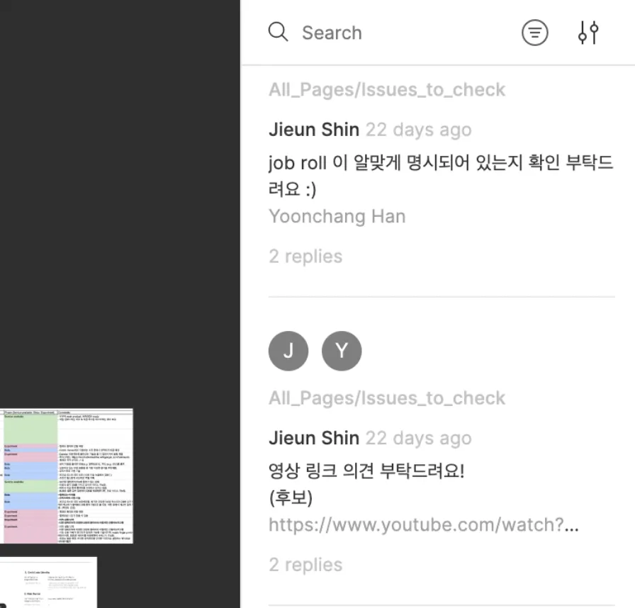 윤창 님: 콘텐츠의 측면에서는 수영 님과 이야기를 나누면서 아이디에이션을 시작했습니다. 둘 다 외부 미팅에서 들었던 니즈를 공유하고, 니즈를 바탕으로 어떤 정보가 들어가면 좋을까에 대한 이야기를 계속해서 주고받았어요. 그러고 나서 실제 작업에 들어갔을 때는 구현을 해야 했기에 디자인 팀과 주로 이야기를 하면서 어떻게 시각적으로 표현할지에 대해 의견을 나눴습니다. 전체적인 틀이 완성되고 나서 디자인 팀과 개발팀에서 컴포넌트를 만들어 오면 이에 대한 피드백을 드리며 같은 그림을 공유하고 구체화하는 작업을 계속했기에 제 경우에는 작업의 처음부터 끝까지 조금씩이라도 관여했네요.