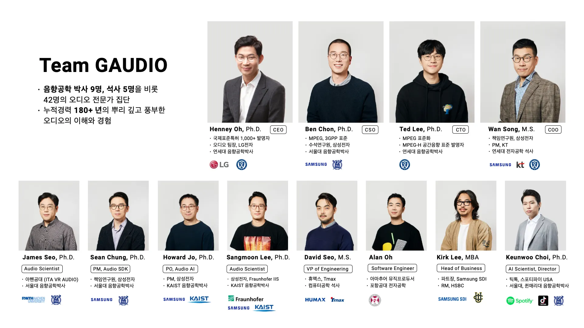 가우디오랩은 세계적으로 손꼽히는 AI/Spatial Audio 기술을 통해, 여러분께서 전혀 경험해 보지 못했던 새로운 차원의 소리 경험을 제공하는 회사입니다. 전 세계적으로 희귀한 9명의 음향공학박사를 포함한 40여 명의 오디오 전문가가 함께합니다. OTT, 스트리밍, AR/VR, 스마트폰, 극장, 자동차 등 소리가 있는 어디나 훌륭한 소리경험을 제공하고 있습니다.
