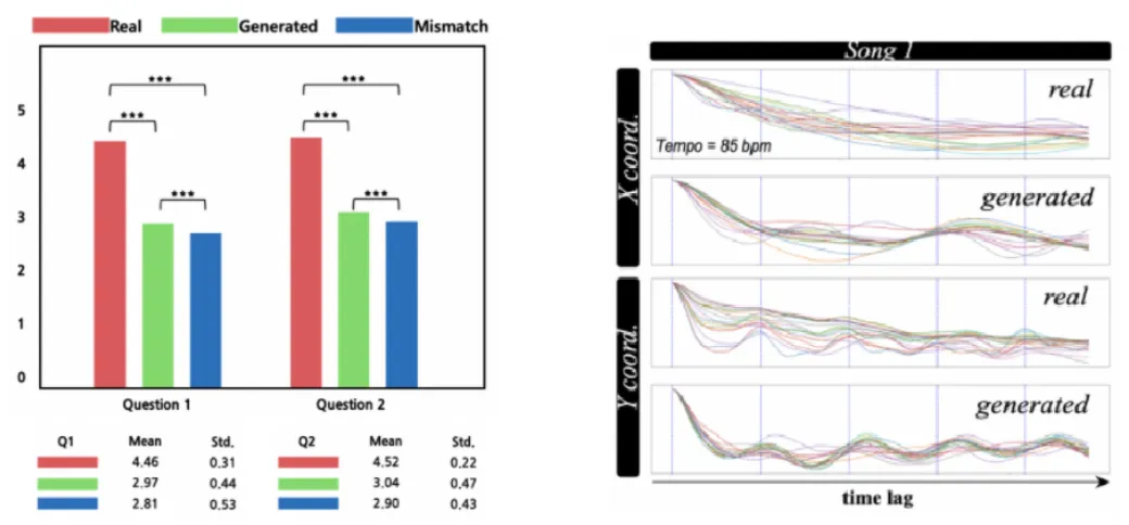 User study and periodicity of dance were used as evaluation methods. The user study asked two performance measures, the naturalness of the dance and the suitability of the dance and music. We compared performance measures for three groups(real dance, dance generated according to the given music, and randomly generated dance). Dance generated according to the music showed better results compared to randomly generated one for all measures.