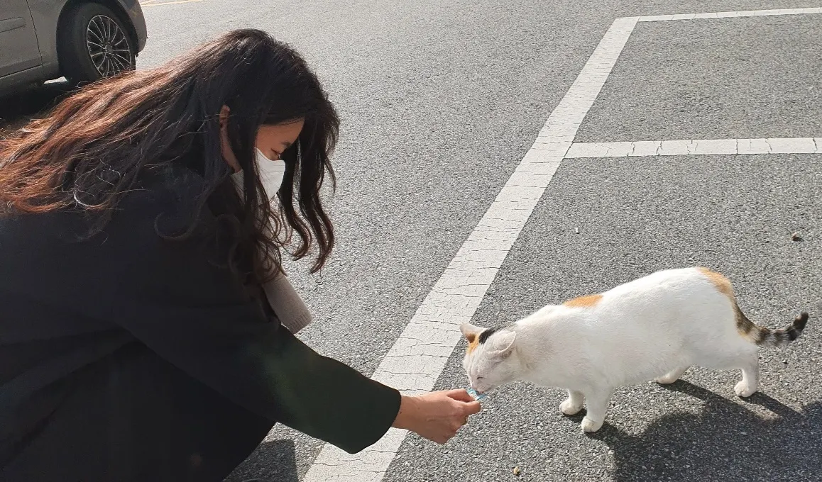 일하는 중간 리프레쉬를 위한 고양이 산책 타임