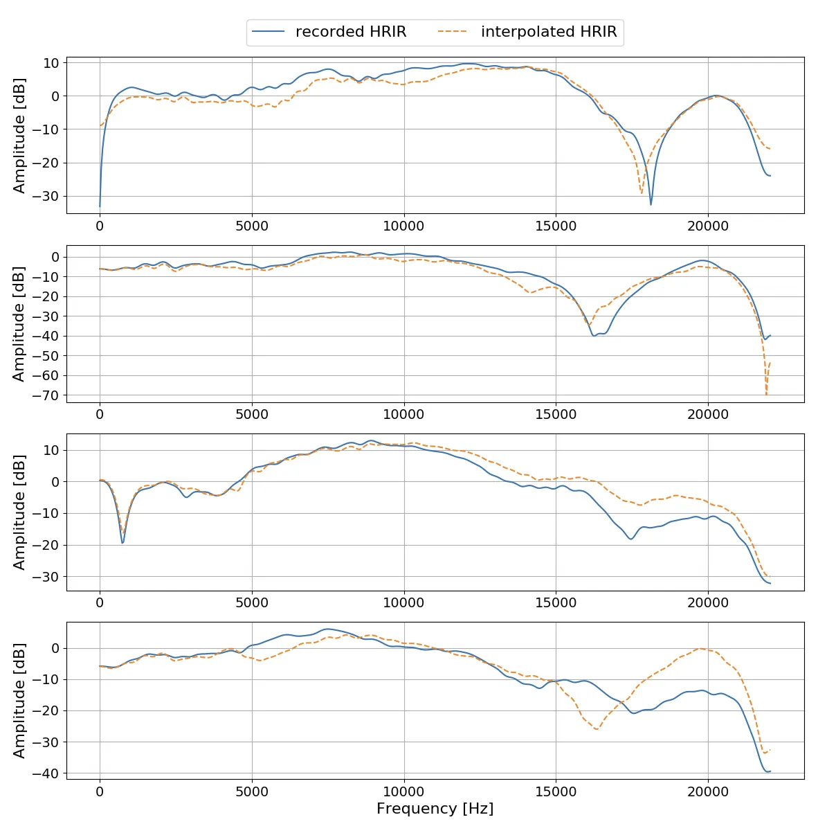Quantitative analysis showed that our method precisely interpolates the HRTFs, outperforming the baseline.